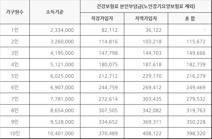 산정된 가구원 전체의 건강보험료 본인부담금(노인장기요양보험료 제외) 합산액이 아래 산정기준표의 건강보험료 금액 이하인 경우 해당
