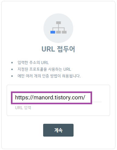 여기서 오른쪽에 있는 "URL 접두어" 영역에 블로그 정보를 입력하고 진행해야 합니다.