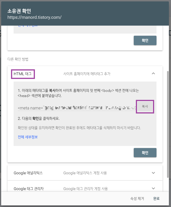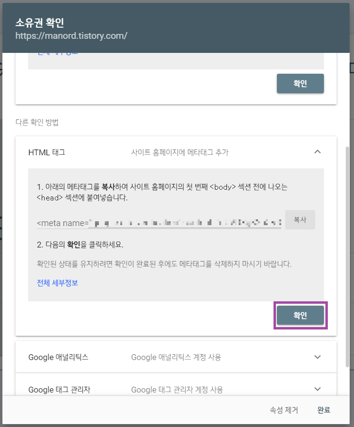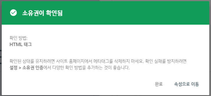 여기서 중요한 부분은 소유권이 확인된 상태를 유지하려면, 사이트 홈페이지에서 메타태그를 삭제하면 안된다는 것입니다.