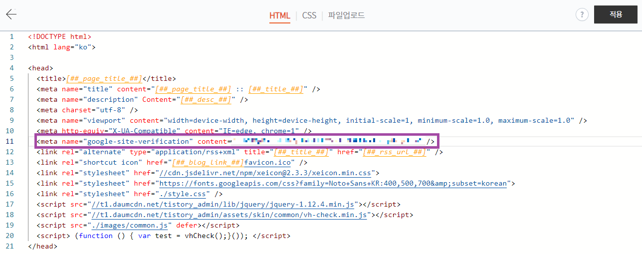 그 다음 아래와 같은 html 편집창이 나오는데, 여기서 <head> 태그 사이에 기존 구글 서치 콘솔에서 복사해 놓았던 스크립트를 붙여 넣어줍니다. 무슨 말인지를 잘 모르겠으면 저 위치에 맞춰서 넣어주면 됩니다.