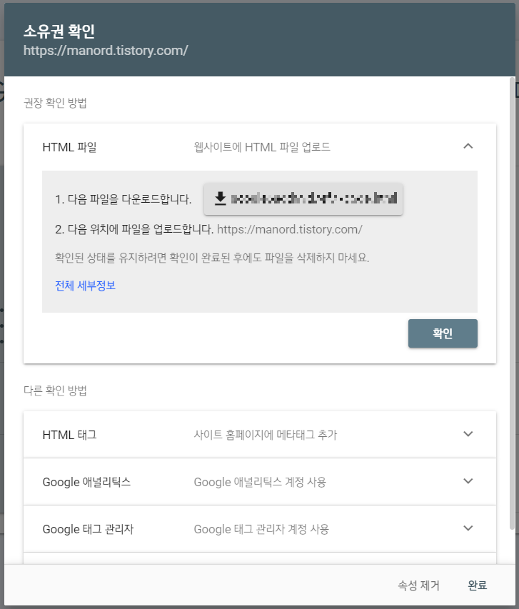 그럼 이제 티스토리 블로그의 주소를 알려주었으니, 해당 페이지의 소유자가 나라는 것을 증명해야 하는 단계를 거쳐야 합니다.