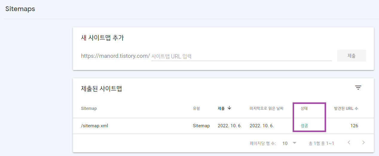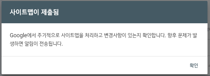 정상적으로 처리되면 아래와 같이 "구글에서 주기적으로 사이트맵을 처리하고 변경사항이 있는지 확인합니다. 향후 문제가 발생하면 알림이 전송됩니다" 라는 메세지가 나오게 됩니다.