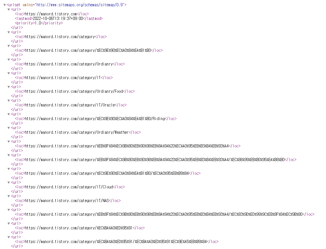 사이트맵에 들어있는 정보는 아래와 같습니다. 대략 살펴보면 블로그의 카테고리와 그에 대한 글 리스트 정보가 xml 파일로 작성되어 있음을 확인할 수 있습니다.