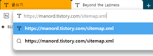이 주소 뒤에 sitemap.xml을 아래 그림과 같이 붙여서 치시면, 내 블로그의 사이트맵 정보를 확인할 수 있습니다.