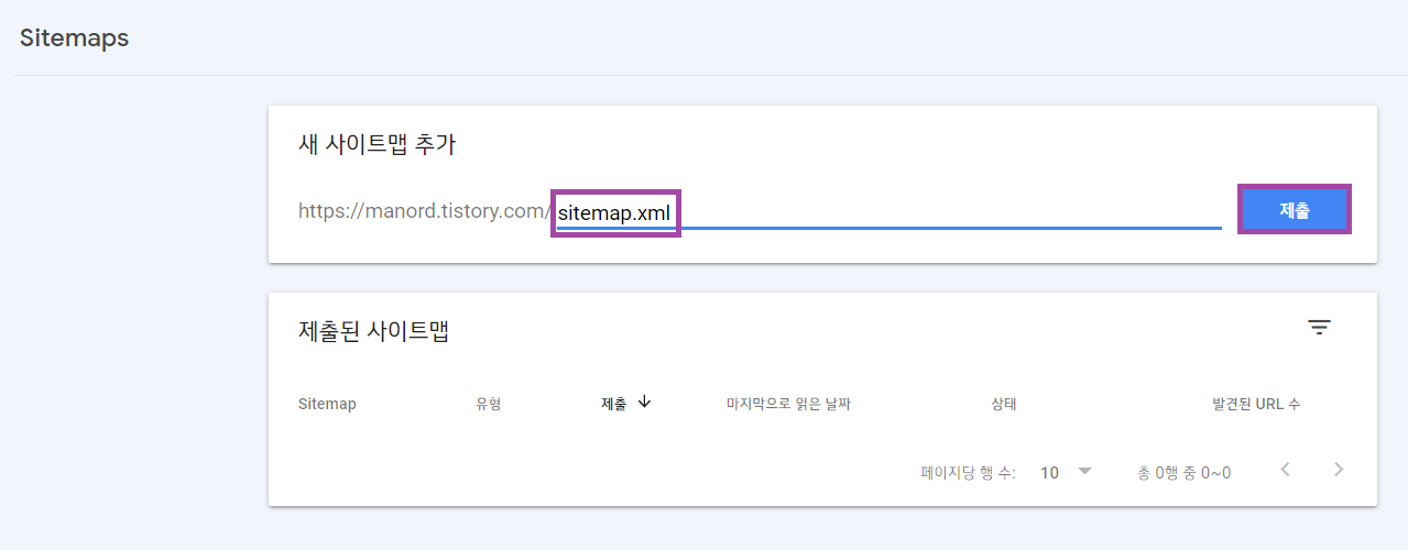 사이트맵 메뉴로 들어가면 아래와 같은 화면이 나타나는데요. 여기서 아래에 표시한 부분에 "sitemap.xml"이라고 입력하고 제출하면 됩니다.