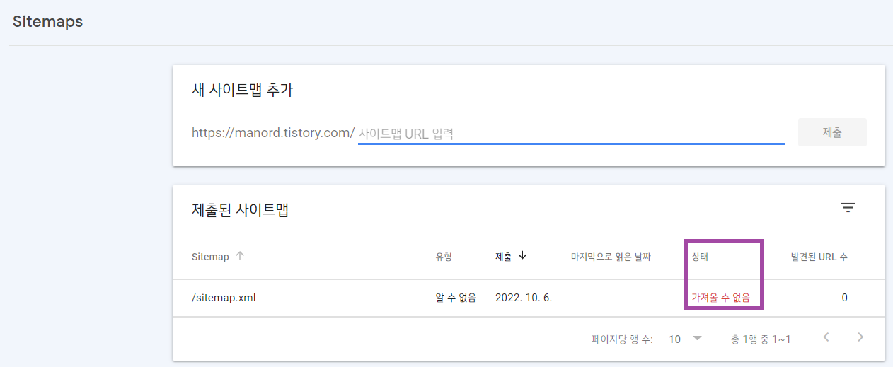 정상적으로 등록하면, 아래와 같이 제출된 사이트맵의 리스트가 조회되는데요. 최초에는 상태가 "가져올 수 없음" 이라고 되어 있습니다.