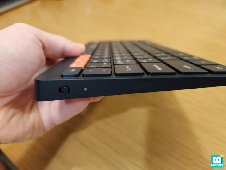 키보드 옆에서 살펴보면 키보드 윗부분은 높이가 있고, 아래 쪽으로 내려갈 수록 높이가 낮아지는 형태를 가지고 있어 휴대형이지만 기울기를 주어 사용에 편안하도록 신경쓴 모습을 알 수 있습니다. 그리고 전원을 켜는 스위치와 전원 상태를 알 수 있는 LED가 있습니다.