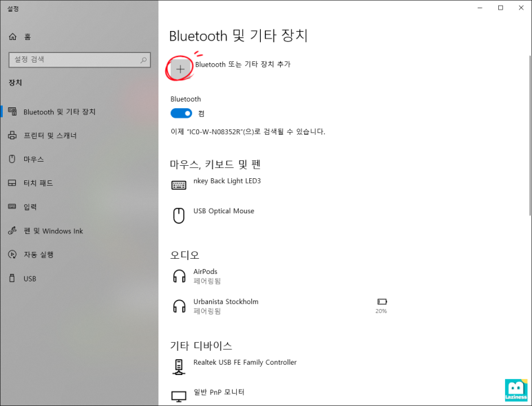 제어판의 설정으로 들어가서 "Bluetooth 및 기타장치" 메뉴를 열어 준 후, 우측 상단에 있는 "Bluetooth 또는 기타 장치 추가" 메뉴를 눌러줍니다.