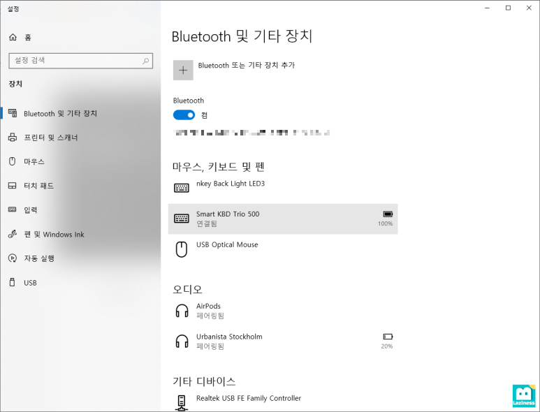 연결이 완료되고 나면 아래와 같이 "마우스, 키보드 및 펜" 영역에 추가된 "Smart KBD Trio 500"을 볼 수 있습니다. 추가적으로 배터리 잔량도 나오니 참고해서 배터리를 교체해주면 됩니다.