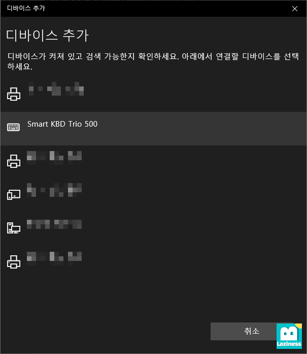 그 다음 검색된 블루투스 장비인 "Smart KBD Trio 500"이 조회가 되는데 이를 눌러줍니다.