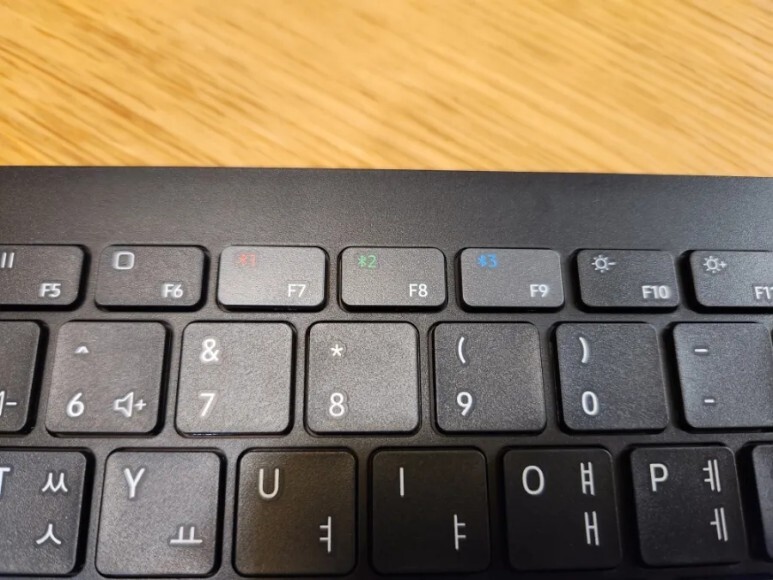 F7~F9번까지 키는 최대 3개의 기기를 멀티페어링 할 수 있도록 해줍니다. 각 버튼에 맞게 등록 한 후, 해당 키보드 버튼을 누르면 동일한 색상의 LED로 전환되어 해당 장비로 키보드 입력을 할 수 있습니다.
