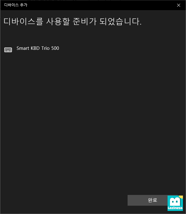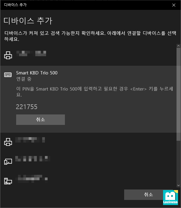 "Smart KBD Trio 500"을 누르면 위 두개의 장치를 연결할 때와 동일하게 PIN번호가 나타나고 입력해 주어야 합니다. 여기에 나타난 번호를 키보드로 입력하고 엔터를 누르면 연결이 완료됩니다.