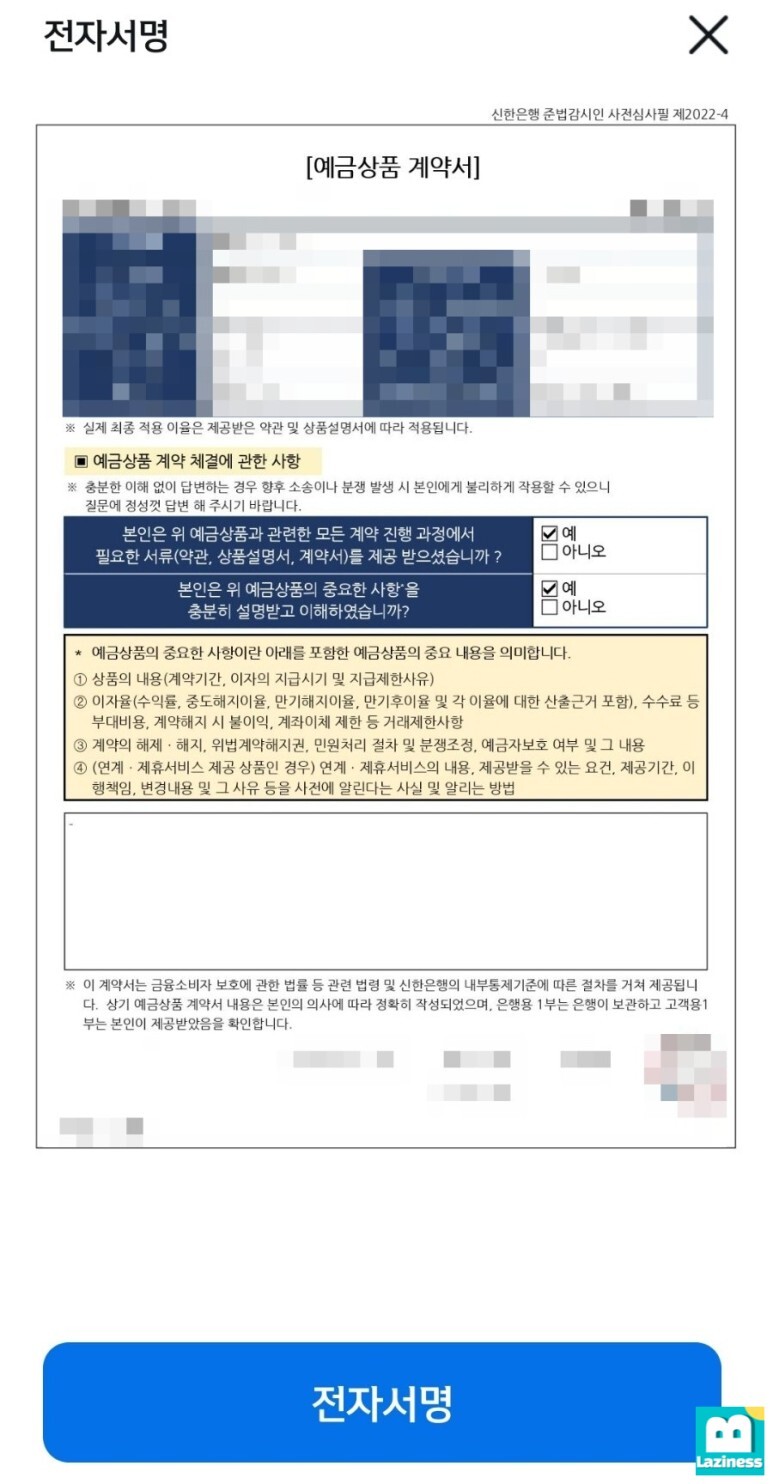 위 입력받은 내용을 기반으로 예금상품 전자 계약서가 만들어지고요. 여기에 전자서명을 진행하면 됩니다. 저처럼 생체인증을 등록해 놓으셨다면 지문인식으로 쉽게 전자서명을 진행할 수 있습니다.
