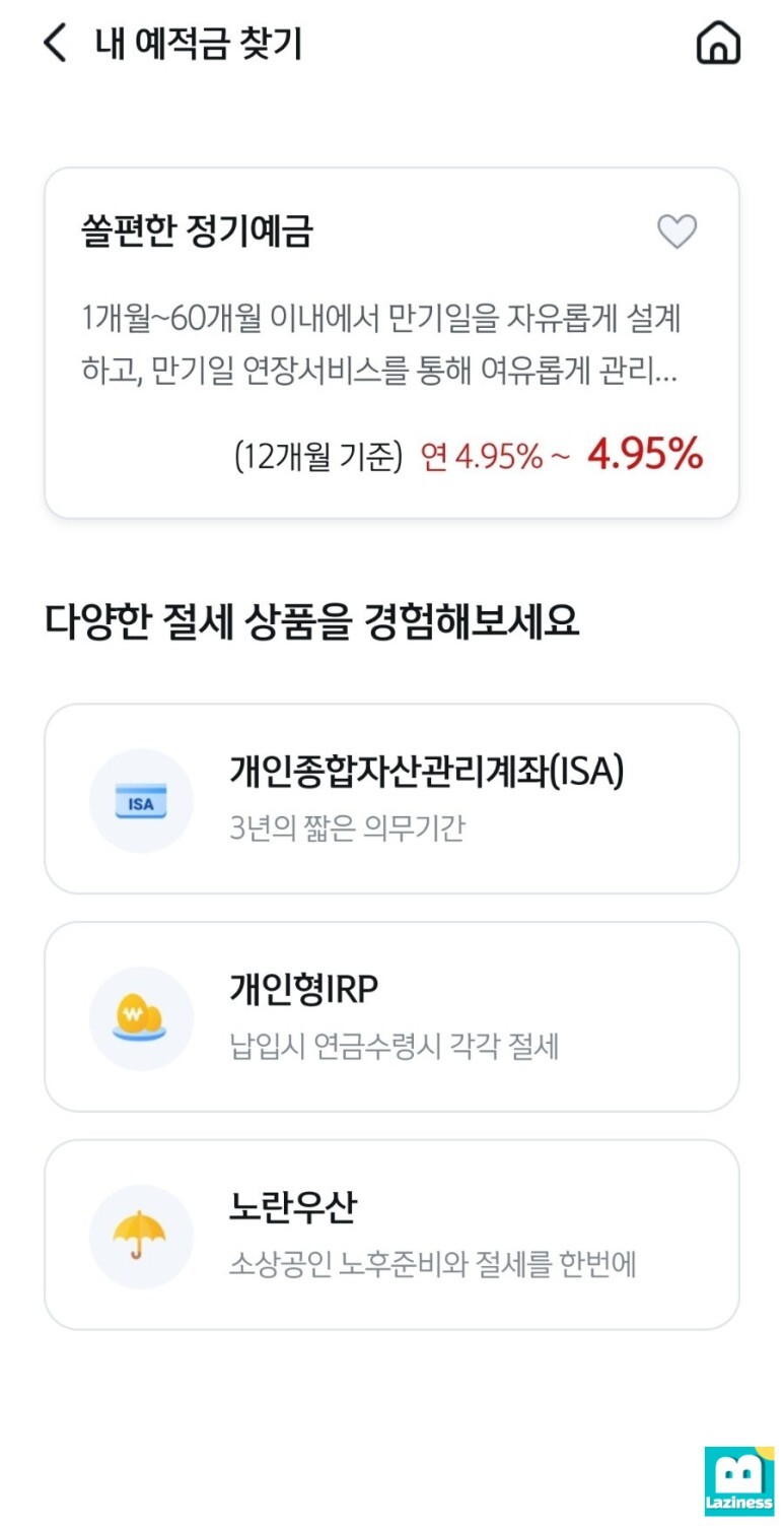 예적금 상품이 아래와 같이 달랑 한개만 나옵니다. 12개월(1년) 기준 4.95% 고정금리이자를 제공하는 "쏠편한 정기예금" 만 있어서 상품을 선택하기 쉽습니다.