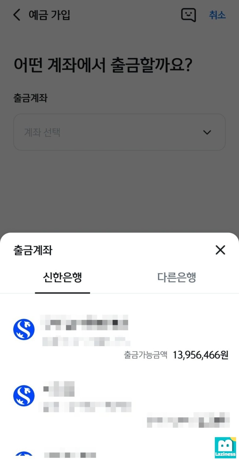 정기예금에 예치하기 위해 어디로부터 돈을 가져올 것인지 지정해 주는데요. 타 은행도 조회가 되지만 전 신한은행 계좌로 이체한 후 계좌 선택을 했습니다.