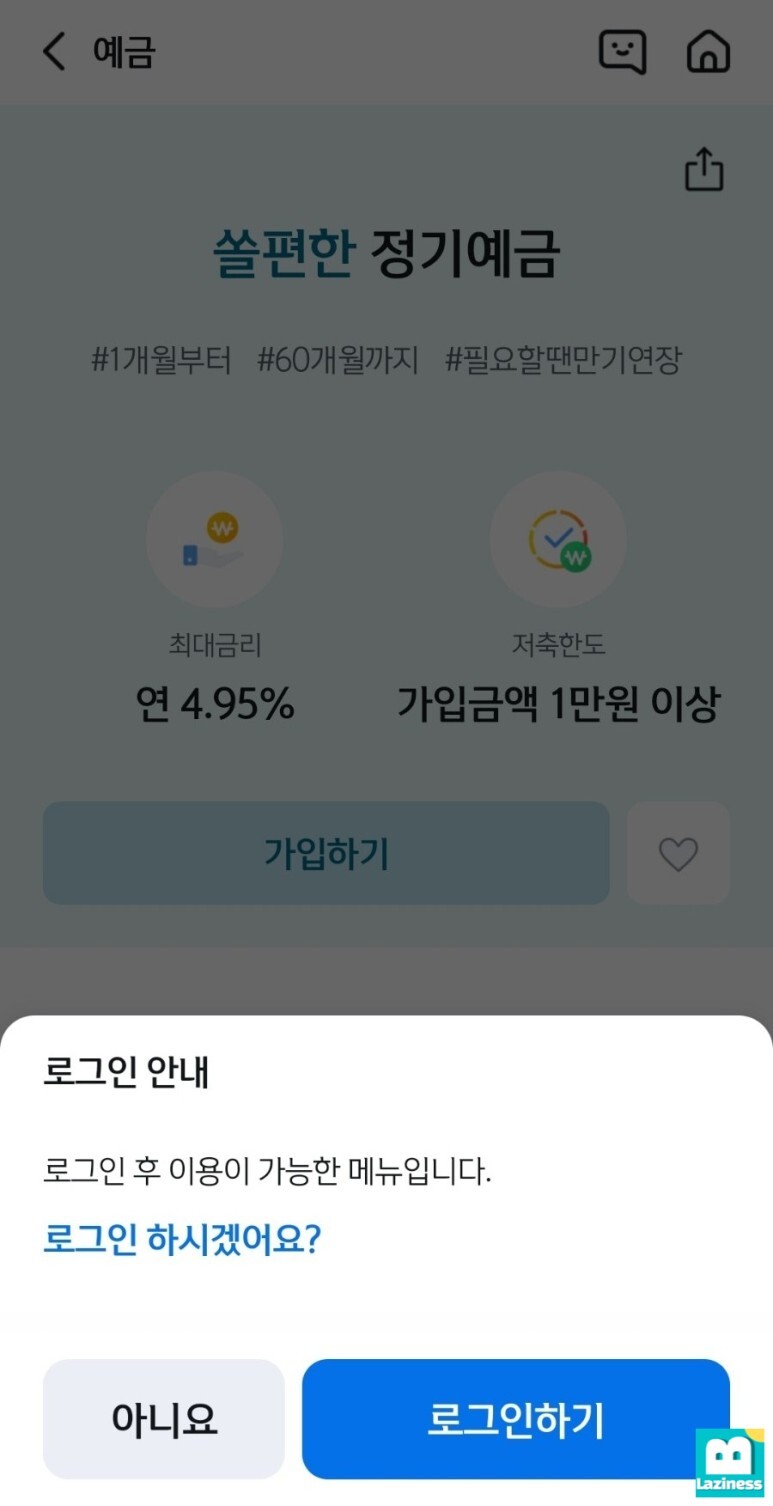 금리와 중도해지에 대한 설명은 보았으니 이제 상품을 가입하기위해 "가입하기" 버튼을 눌러주면 로그인을 먼저 진행해야 합니다.