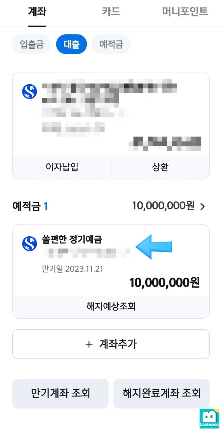 마지막으로 정기예금 계좌가 정상적으로 생성되었는지를 확인하기 위해 메인 화면에서 상단의 내계좌 옆에 있는 "전체보기"를 눌러 아래로 내려보면, 예적금 항목에 1000만원으로 정상적인 것을 확인할 수 있습니다.
