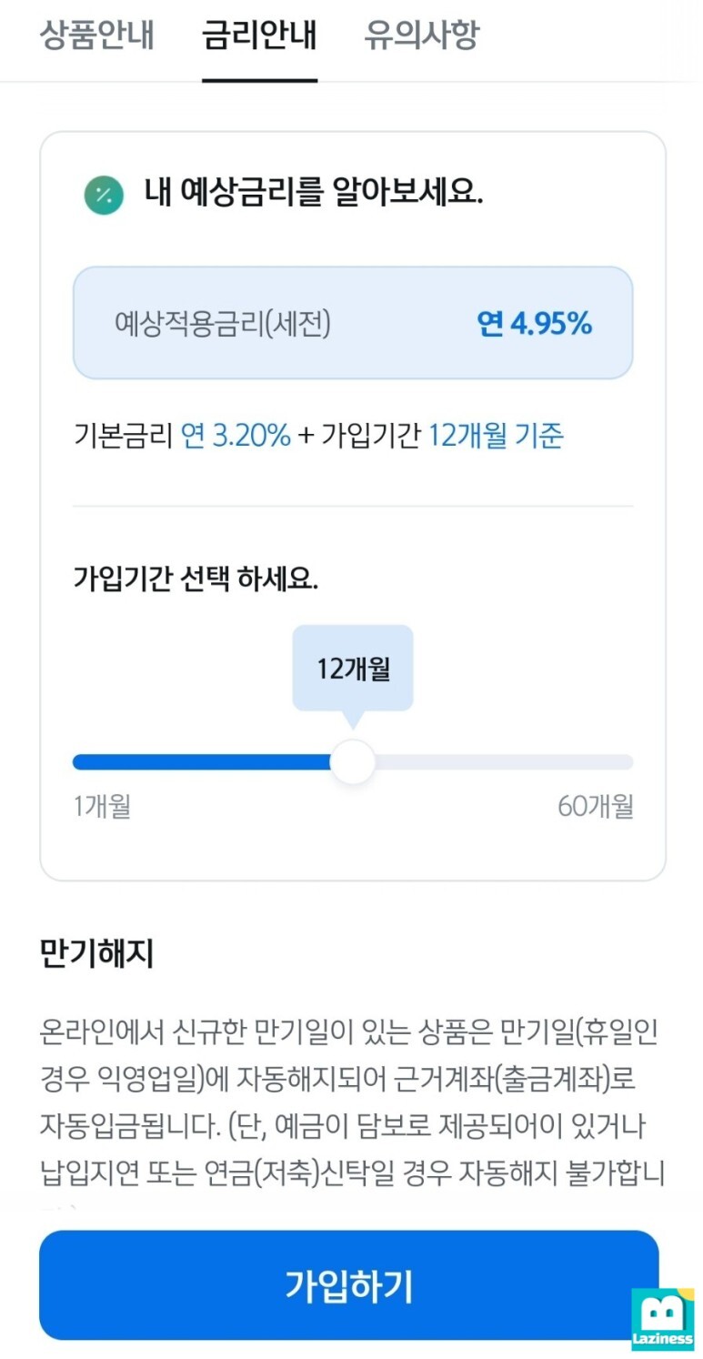 쏠편한 정기예금을 선택하면, 아래와 같이 예상 적용 금리를 확인할 수 있습니다. 12개월 기준으로 기본금리 연 3.2%에 가입기간 12개월 기준으로 적용받을 수 있는 금리는 4.95% 조회가 됩니다.