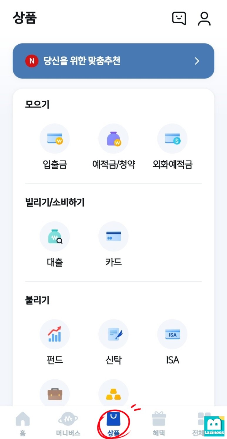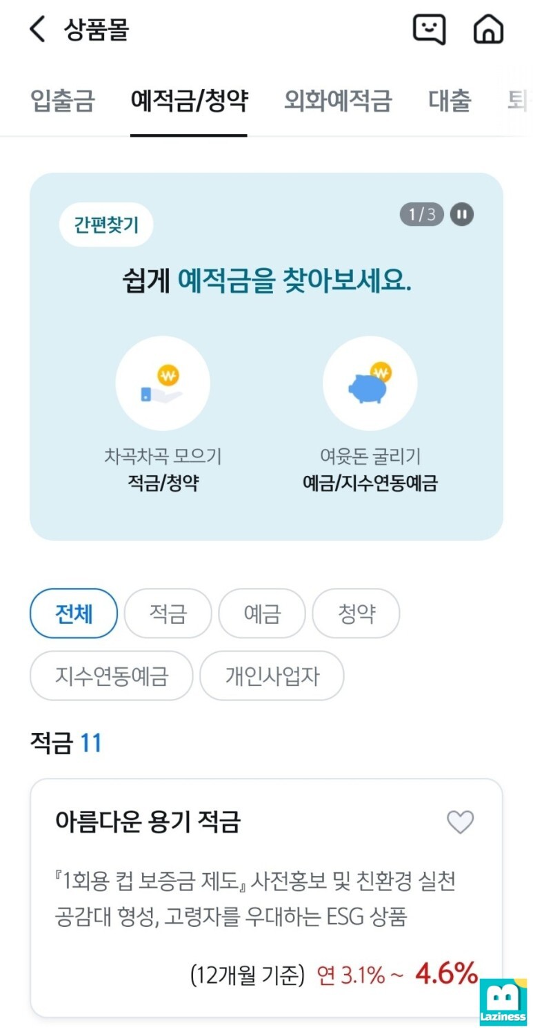 그 다음 아래와 같이 상품 리스트가 나오게 되는데요. 예금 상품을 알아보고 있기 때문에 복주머니 모양의 "예적금/청약"을 선택합니다.