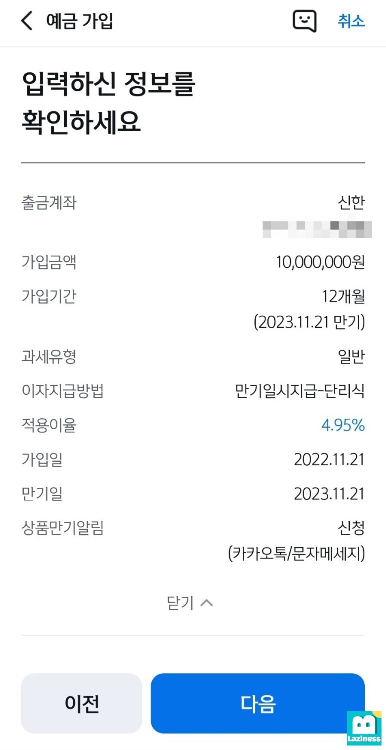 그렇게 최종적으로 정기예금가입에 필요한 입력한 정보를 최종적으로 확인합니다. 가입기간 12개월, 적용이율 4.95%, 만기알림설정 등 제대로 있는 것을 확인하고 "다음" 버튼을 눌러줍니다.