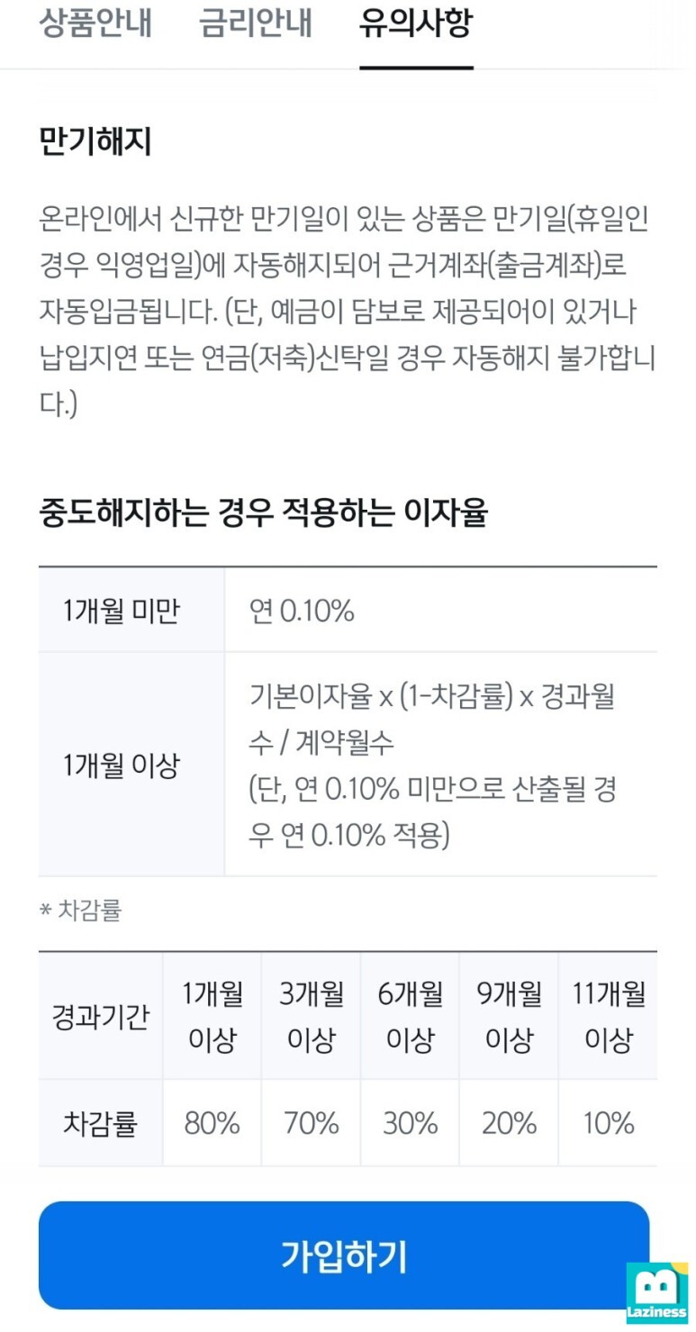 중도해지와 관련된 이자율(차감율)은 아래와 같습니다. 짧은 기간의 이자는 0.1%로 이자가 거의 없다고 생각하시면 되구요. 1개월 이상은 "기본이자율 * (1-차감율) * 경과월수/계약월수"가 적용됩니다.