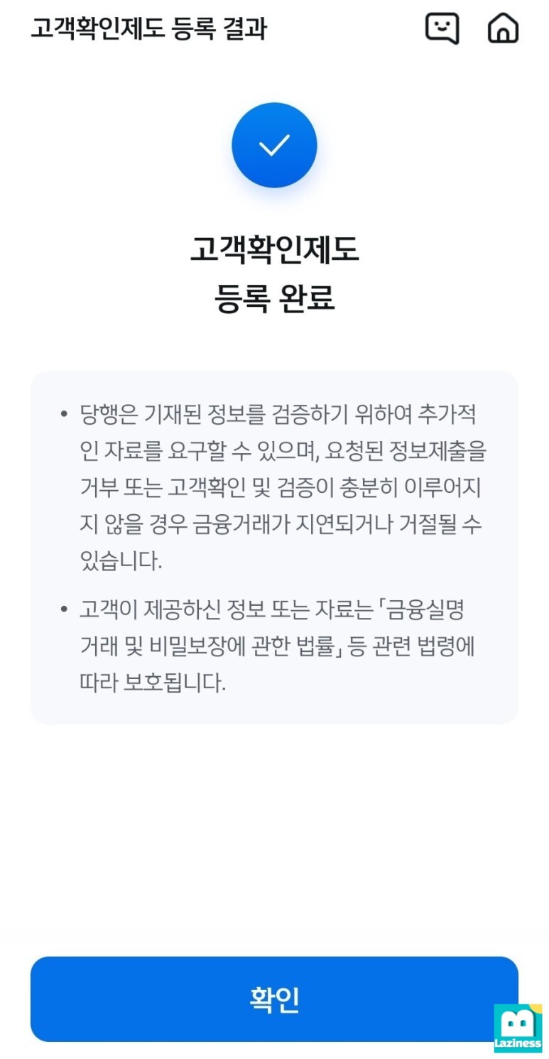 신분증에 대한 확인 절차까지 마치면 아래와 같이 "고객확인제도 등록완료"라는 화면이 나타나는데요. "확인" 눌러 다음으로 진행합니다.