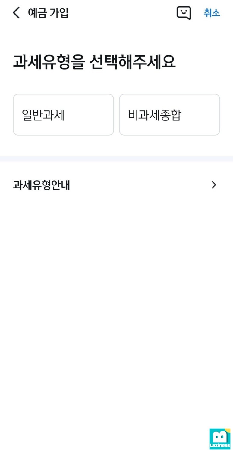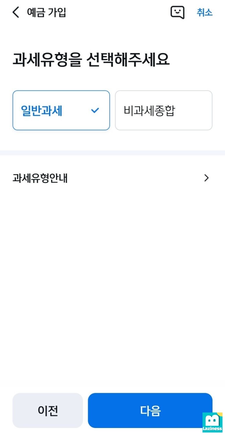 이자에 세금을 떼지 않는 다는 것이니 한도가 된다면 비과세종합으로 가입하시면 되겠죠? 저는 한도가 없기 때문에 "일반과세"를 선택해서 진행합니다.