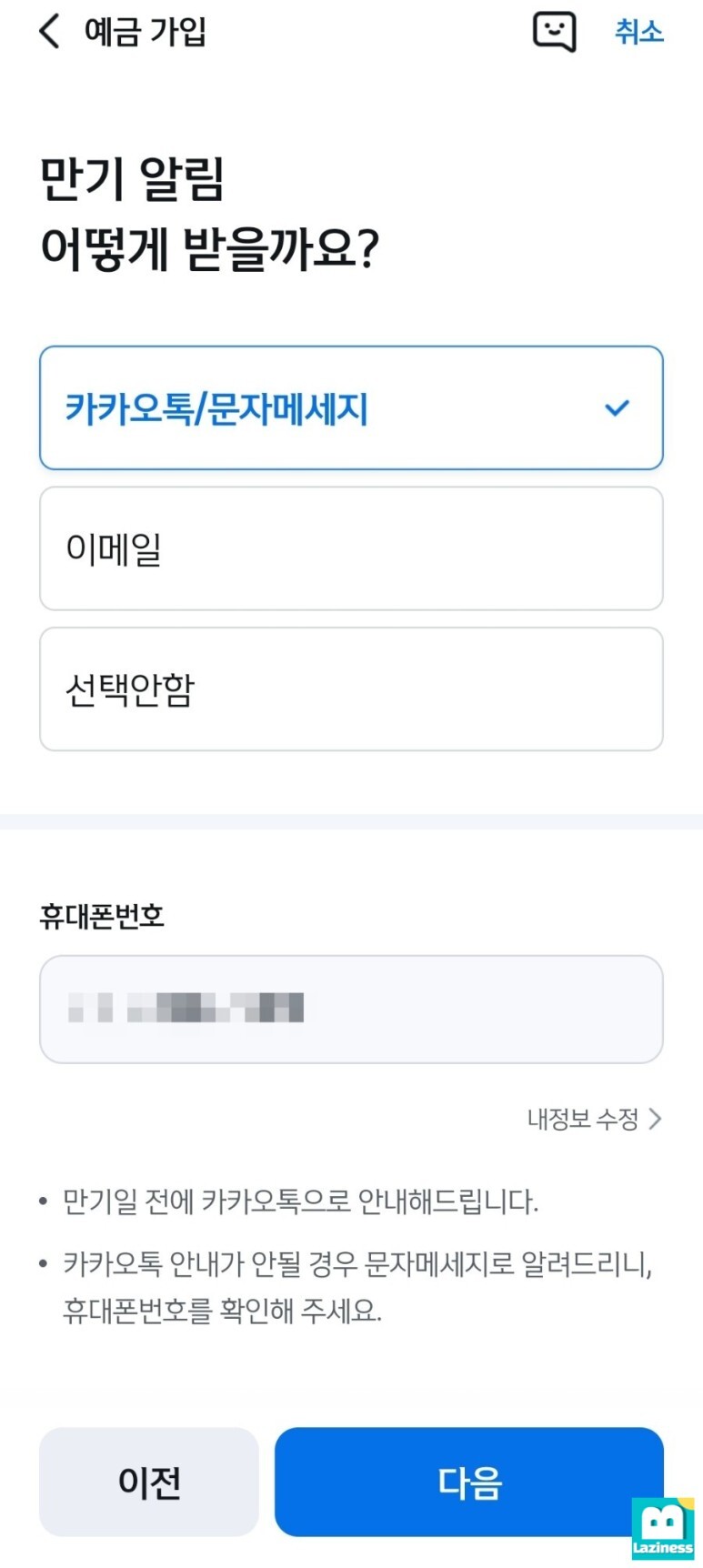 정기예금 만기일에 대하여 아래와 같이 만기 알림을 받아 볼 수 있습니다. "카카오톡/문자메게지"으로 기본 선택되어 있으니 수신을 받을 연락처를 정확히 확인한 후 "다음" 버튼을 눌러줍니다.