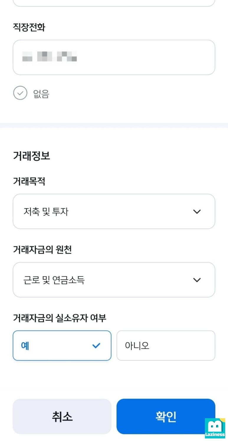 그 다음은 아래와 같이 거래정보에 근로자이기 때문에 거래목적에 "저축 및 투자", 거래자금의 원천을 "근로 및 연금소득"으로 입력하고 "확인" 버튼을 눌러 다음으로 진행합니다.