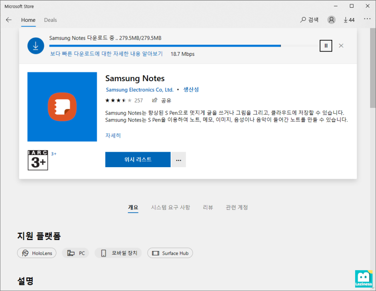 그래서 Microsoft Store로 들어가 Samsung notes를 다시 검색해서 들어갔더니, 알아서 다운받아 업데이트를 진행합니다.