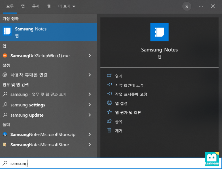 설치가 완료된 후 검색창에서 Samsung Notes를 찾아서 실행시켜 봅니다.