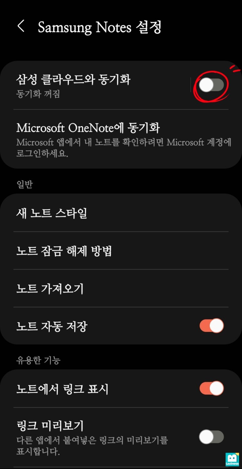 권한을 허용하고 난 후에는 삼성 클라우드 동기화 옆에 스위치 버튼이 추가되었는데요. 이를 눌러 켜 줍니다.