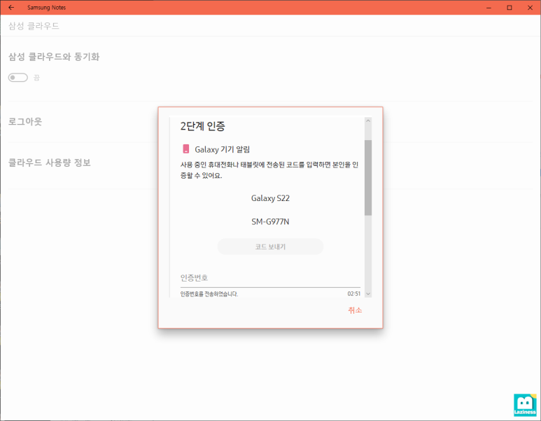 로그인할 때 2단계 인증을 거치도록 되어 있습니다. 계정에 대해 안전하게 확인하는 것이 좋은 습관이지요. 본인이 사용하는 모바일 장치로 인증번호 메세지가 가서 인증을 진행하면 정상적으로 로그인 및 삼성 클라우드 동기화가 켜집니다.