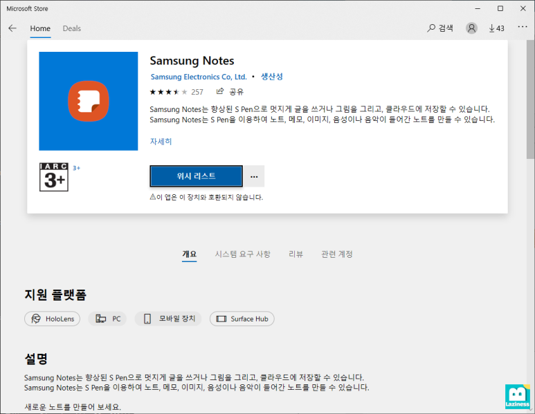 설치대신 위시 리스트 버튼 아래를 잘 보시면, "이 앱은 이 장치와 호환되지 않습니다"라고 나와있습니다. 이 말의 의미는, 삼성전자 노트북이 아니면 위 앱을 설치해서 사용할 수 없다는 이야기이죠!!