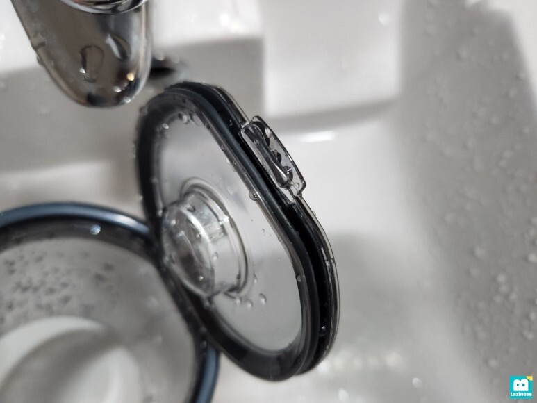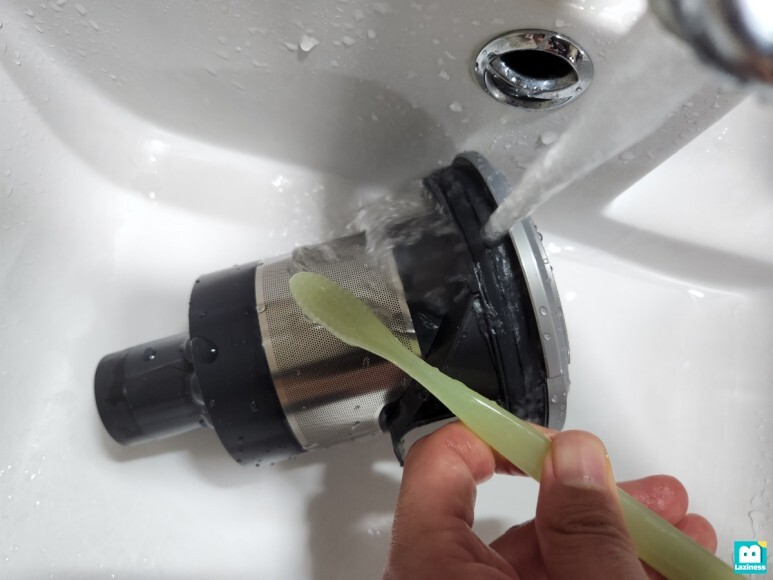 수도꼭지를 틀어 물을 아래로 흐르게 하면서 칫솔로 여기저기 깨끗하게 씻어줍니다. 상단 고무패킹이 있는 곳도 칫솔로 꼼꼼히 씻고, 금속 필터쪽도 꼼꼼히 씻어 줍니다.