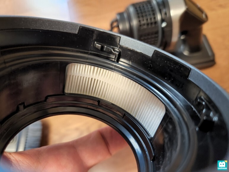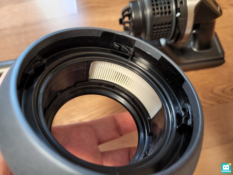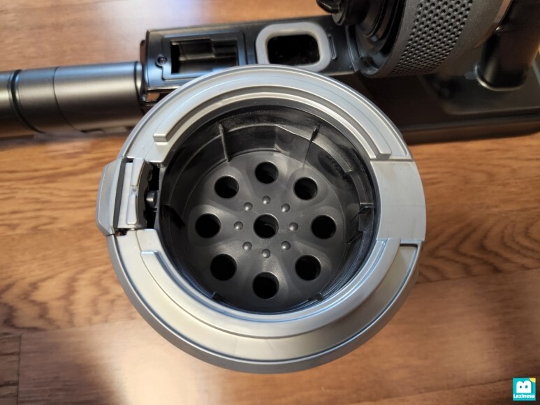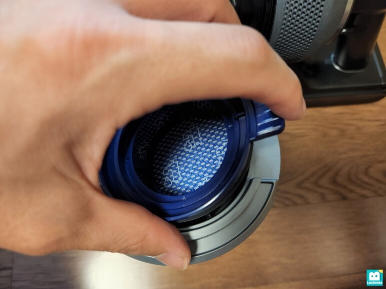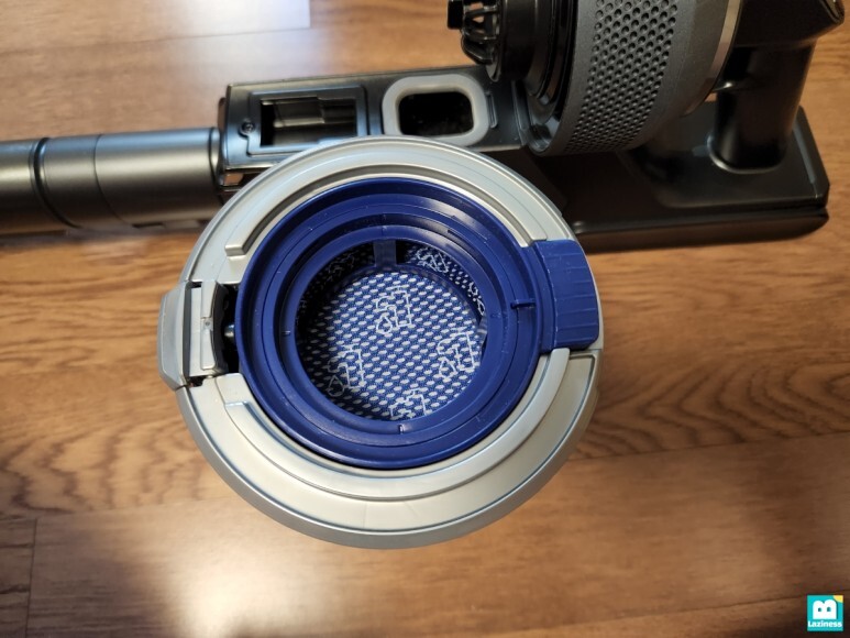 분리한 먼지통 상단에는 아래사진에서 볼 수 있듯이 파란색 필터가 들어 있는데요. 손잡이를 잡고 위로 올려주면 아래와 같이 쉽게 분리가 됩니다.
