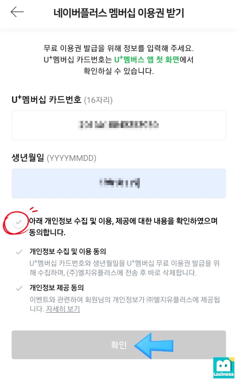 기존에 실행했던 LGU+ 멤버스 앱을 띄워서 메인화면에 있는 멤버십 카드번호를 보고 입력을 해주면 됩니다. 그 다음 가입자의 생년월일 정보를 넣은 후 개인정보에 대한 활용 동의를 하고나서 "확인" 버튼을 눌러줍니다.