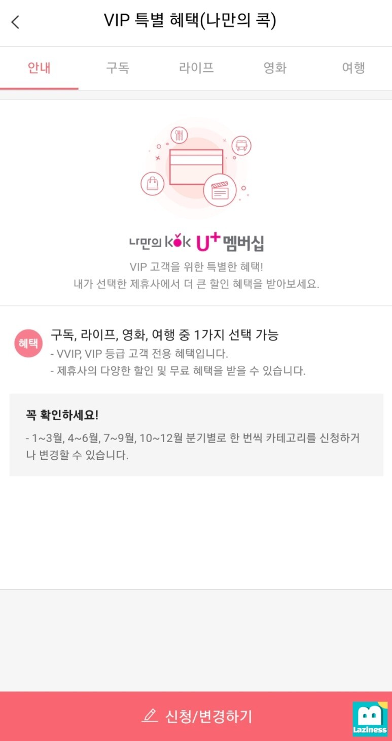 그럼 아래와 같이 VIP 특별혜택 정보들이 나오는데요. VIP서비스는 크게 구독, 라이프, 영화, 여행 으로 구성되어 있는데 여기서 1개의 서비스를 지정해 사용할 수 있습니다.