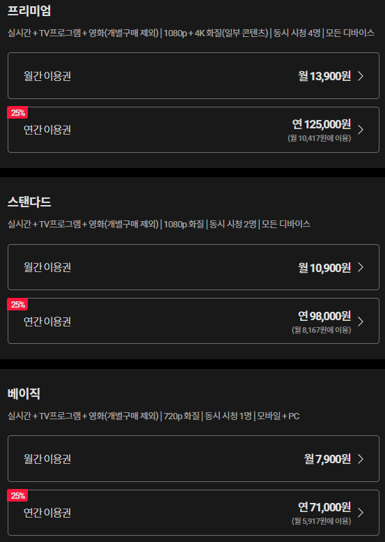 하지만! 초고화질인 1080P 및 4K 영상을 보기위해서는 월 9000원을 부담해야 합니다! 거기에 기존 베이직 서비스에서는 동시사용자수가 1명인데, 모바일 PC뿐 아니라 스마트TV에서도 사용 가능하고 동시 사용자수도 4명으로 늘어납니다.