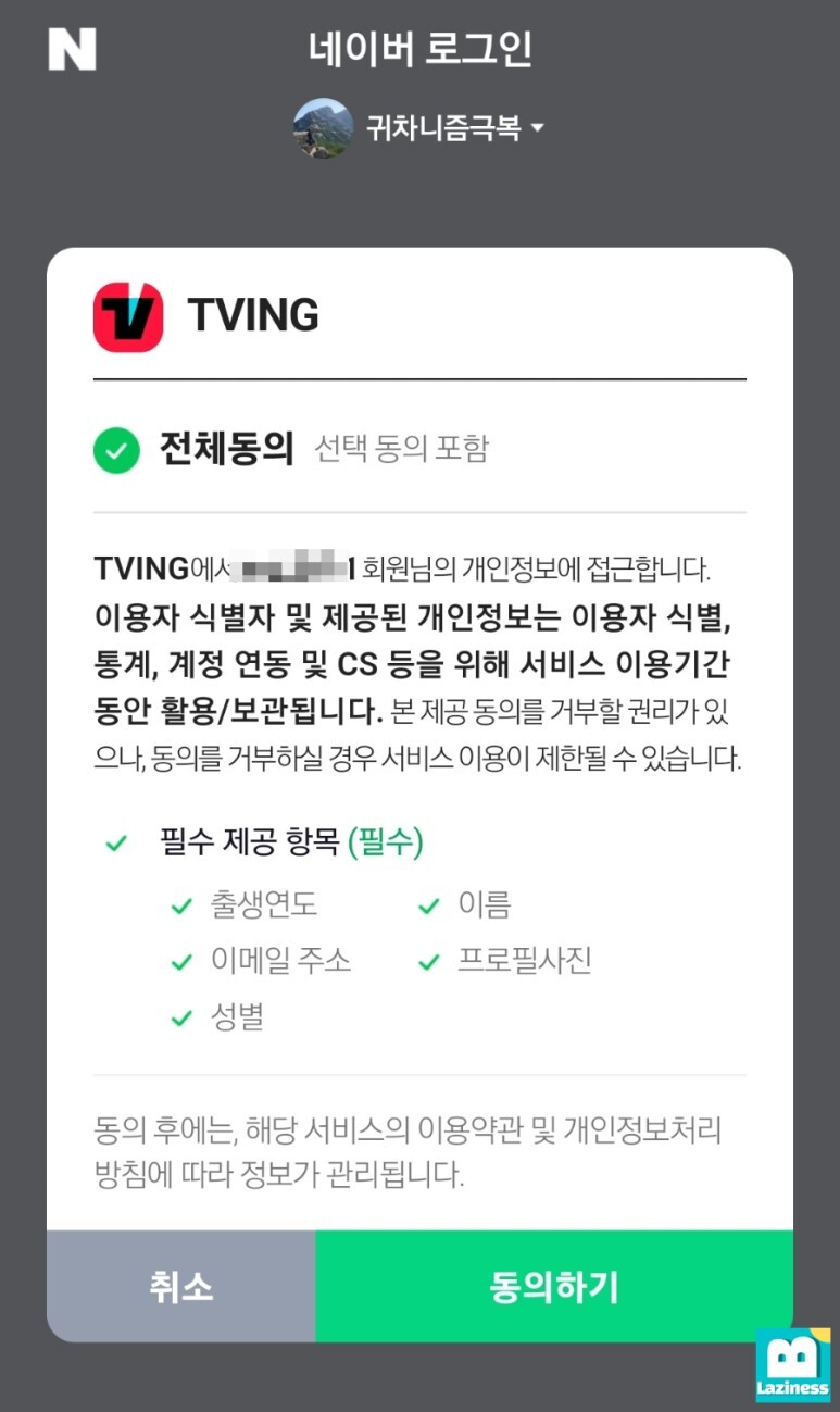 그 다음에는 네이버에서 보관한 개인정보인 출생연도/이름/이메일주소/프로필사진/성별을 티빙에 제공한다는 전체동의 필수사항을 체크하고 "동의하기" 버튼을 눌러줍니다.