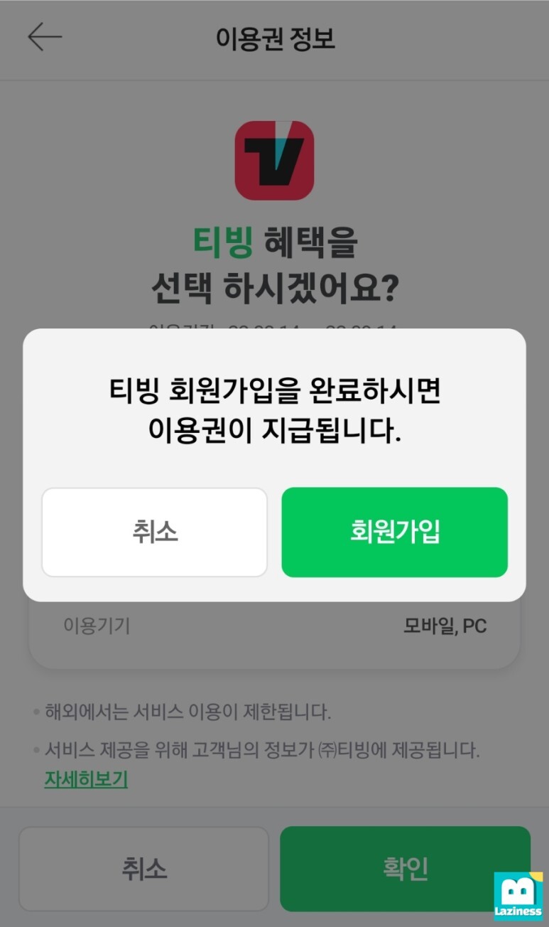위 디지털 콘텐츠+에서 티빙을 선택하면 아래와 같이 "티빙을 선택하시겠어요?"라는 메세지가 나오고, 이를 눌러주면 아래와 같이 티빙 1개월 이용권이 지급됩니다. 맨 위에 첨부해 놓은 요금제를 보시면 티빙 베이직 요금제의 서비스이니 참고하시구요.