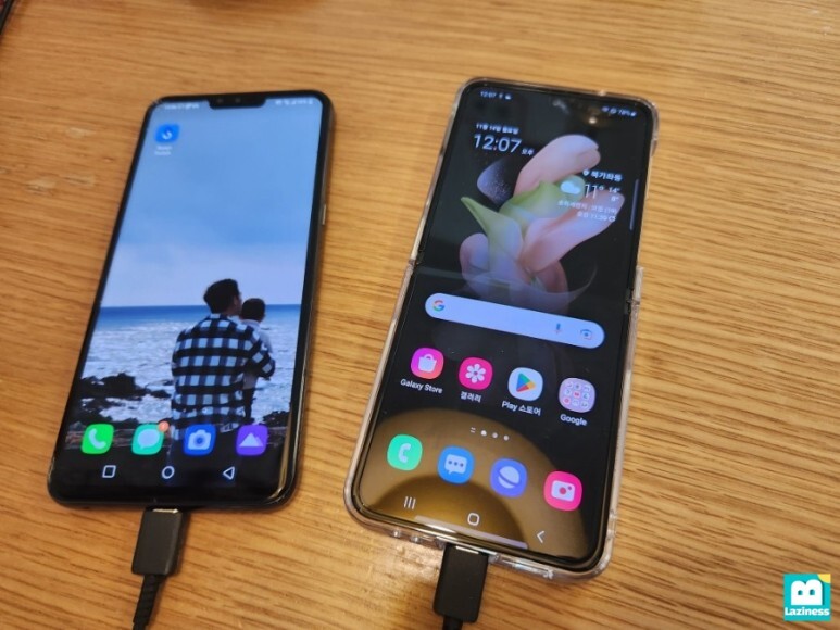 두개의 핸드폰 모두 USB C-type 단자를 가지고 있기 때문에, 제트플립4에 기본으로 포함된 C to C 케이블을 연결해 주었구요.