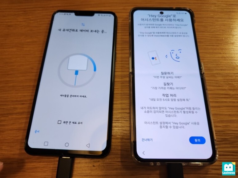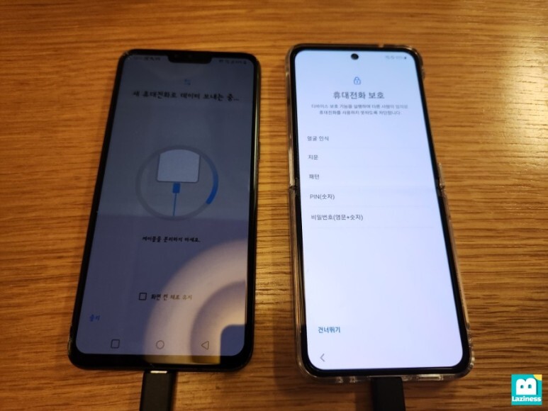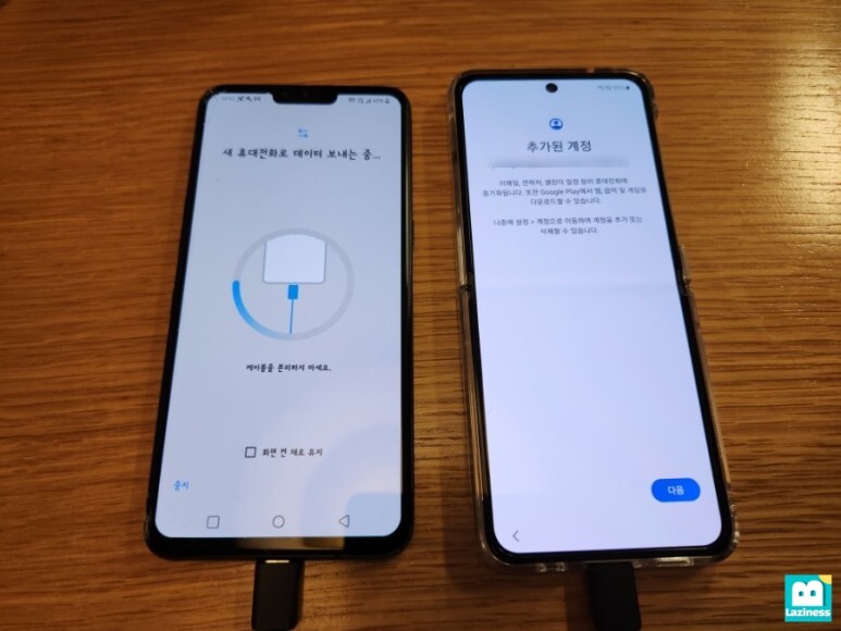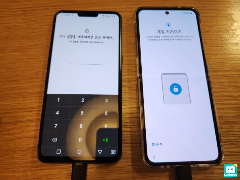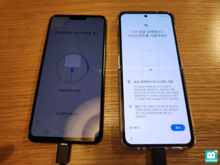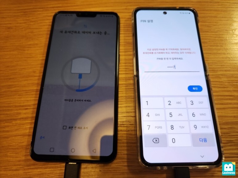 새 휴대전화에서는 "이전 휴대전화에서 데이터 가져오는 중..."이라고 뜹니다. 이제 데이터가 옮겨지는 것이죠.