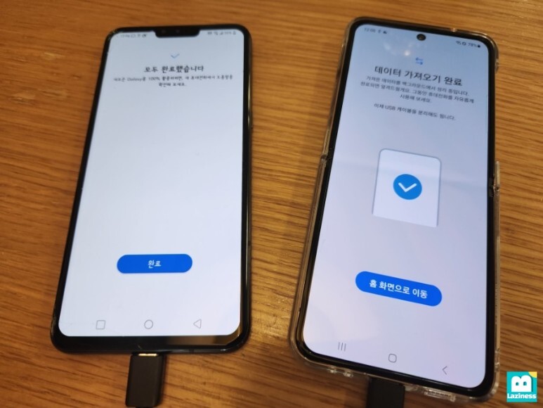 기존 핸드폰에는 "모두 완료했습니다", 신규 핸드폰에는 "데이터 가져오기 완료" 메세지가 표시되고요.