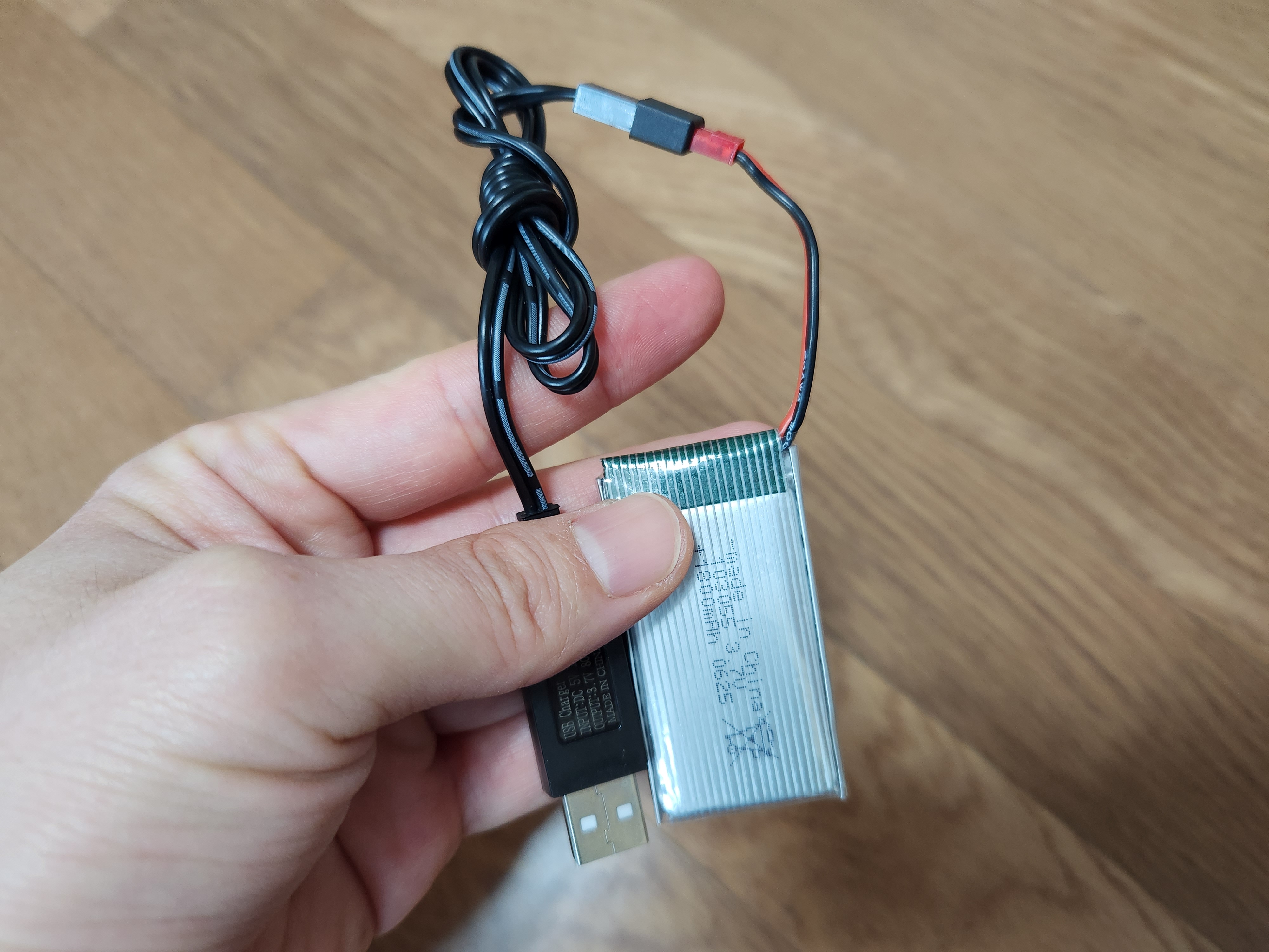 이제는 드론 본체에 들어가는 배터리를 준비해야 하는데요. 아래와 같이 배터리와 이를 충전할 수 있는 케이블을 꺼냅니다.