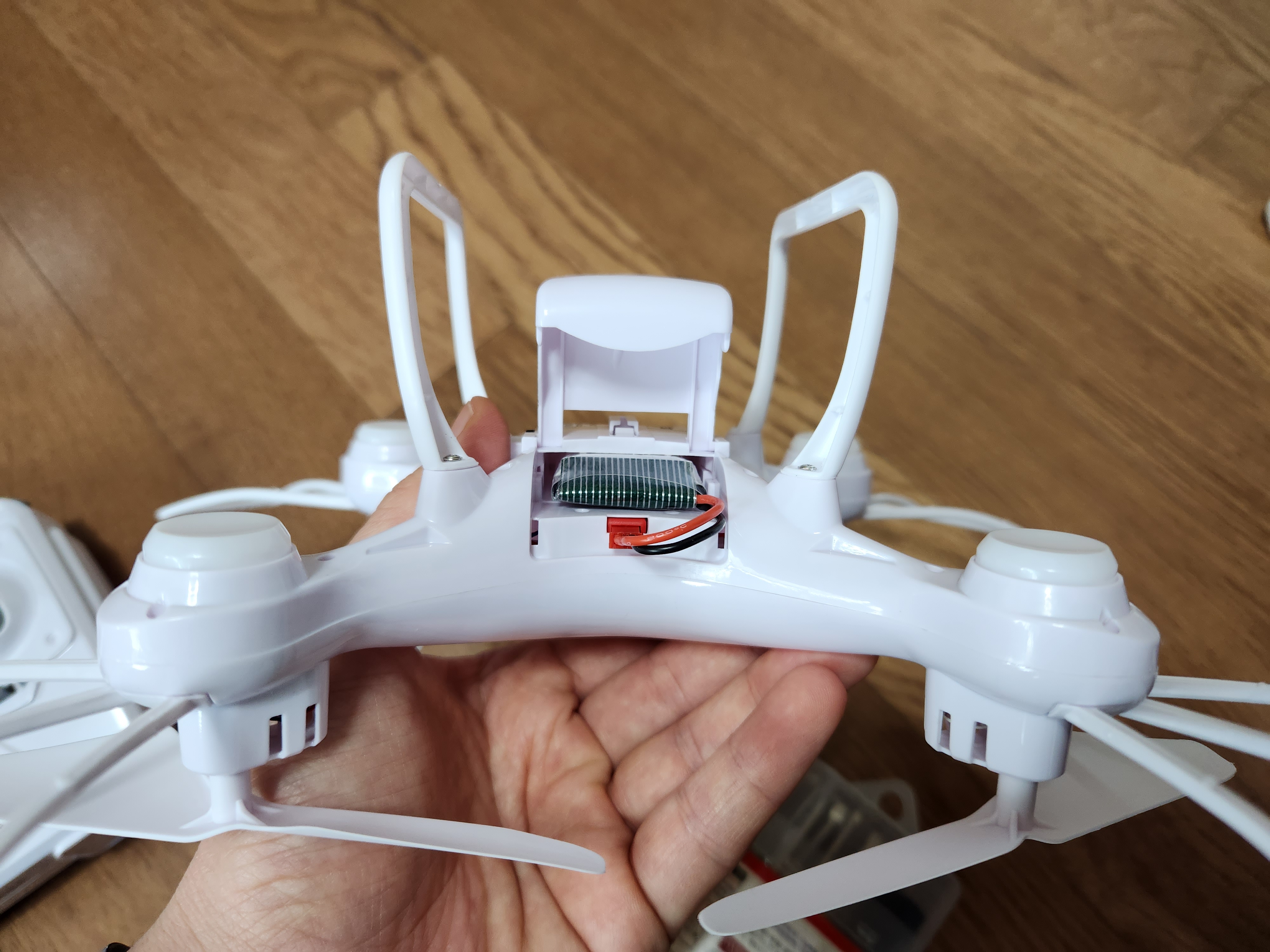 비행시간이 긴 이유도 본체가 아래와 같이 좀 큰 편입니다. 아무래도 장시간(?)을 비행해야하기 때문에 큰 배터리를 활용하기 위해 본체와 프로펠러가 큽니다만 실제로 무게는 상당히 가볍습니다.