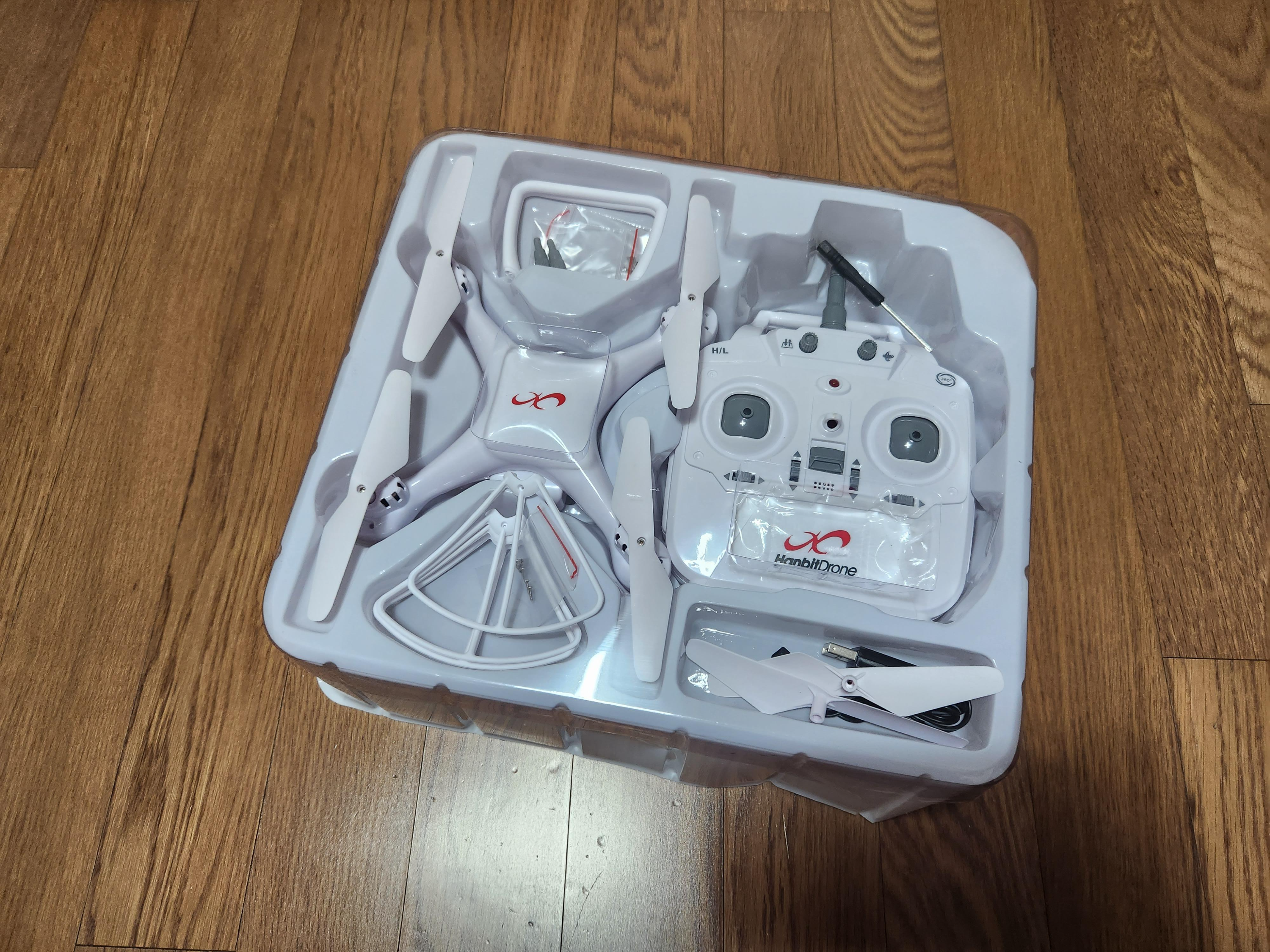 박스를 열면 아래와 같이 드론본체와 조립할 수 있는 가드들과 여분의 프로펠러, 그리고 조정기 및 배터리와 케이블 등이 포함된 모습입니다.
