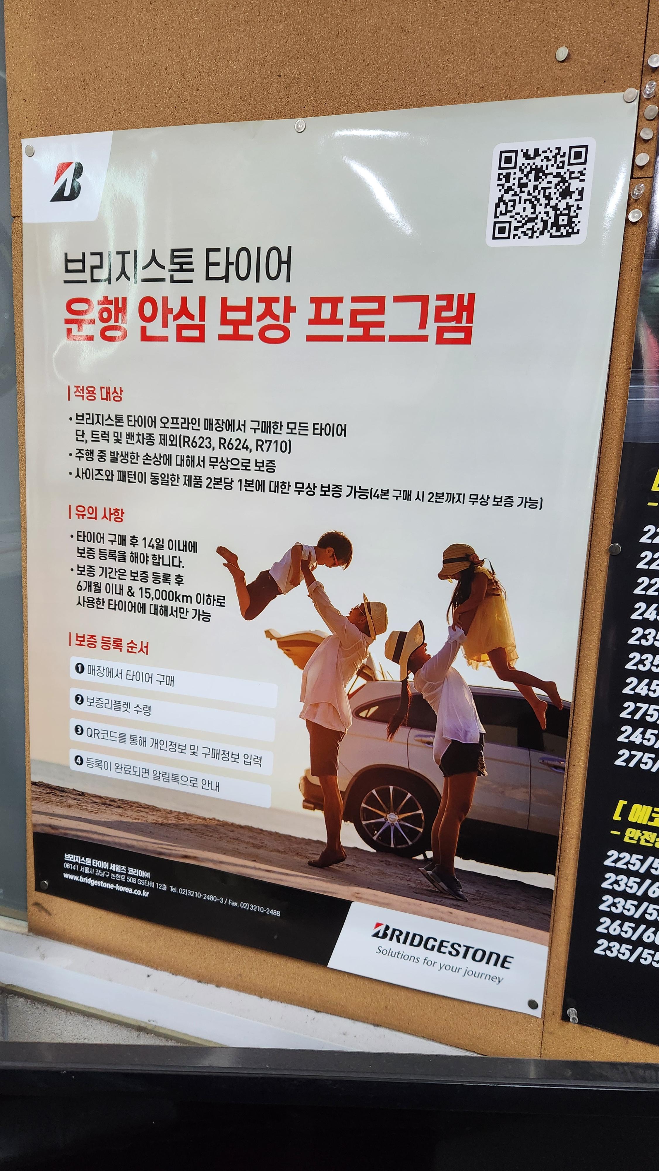 아래와 같은 운행 안심 보장 프로그램이 있었는데요. 브릿지 스톤 오프라인 매장에서 구매한 모든 타이어에 대해 주행 중 발생한 손상에 대해 무상으로 보증을 진행합니다. 2본당 1개로 4본을 교환했으면 2본을 무상 보증해준다는 건데요. 6개월 이내 15,000km 이하 주행만 보상이된다고 되어있네요. 뭐 문제가 발생하면 방문해서 처리하면 되겠죠?