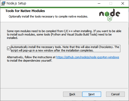 네이티브 모듈을 위한 도구 설치가 나오는데요. 컴파일 등과 관련된 내용이라 옵션에 체크를 설치하고 설치를 진행했습니다. Chocolatey라는 것은 "초콜릿 같은" 의미가 아니라 설치되는 소프트웨어의 이름이더군요.
