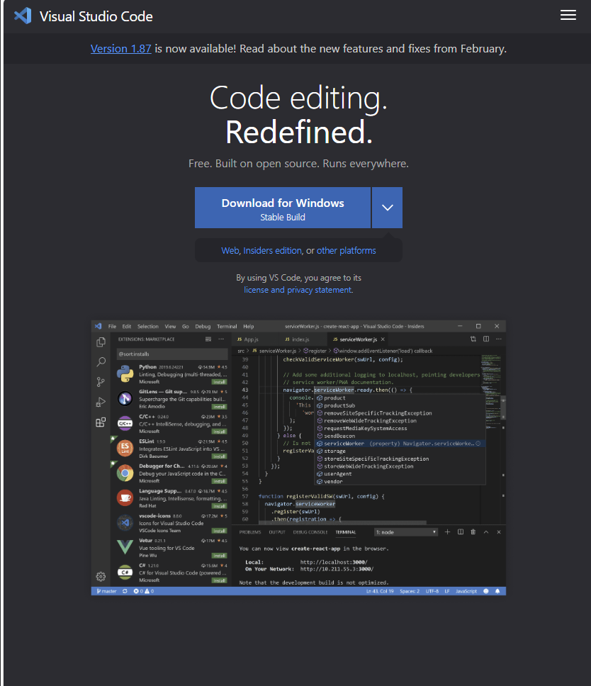 Visual Studio Code is a code editor redefined and optimized for building and debugging modern web and cloud applications. Visual Studio Code is free and available on your favorite platform - Linux, macOS, and Windows.